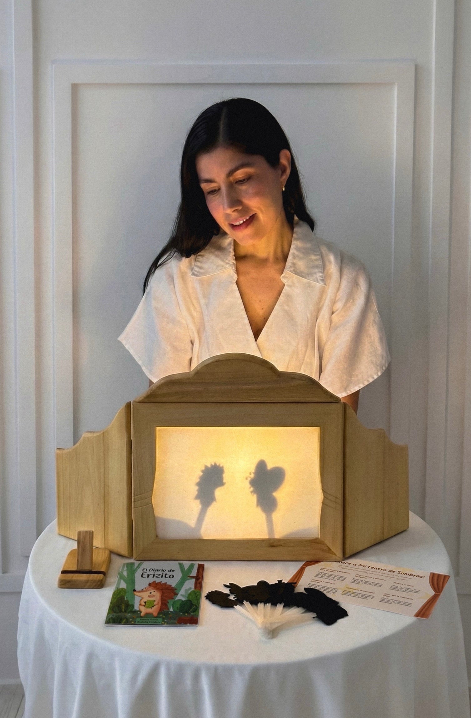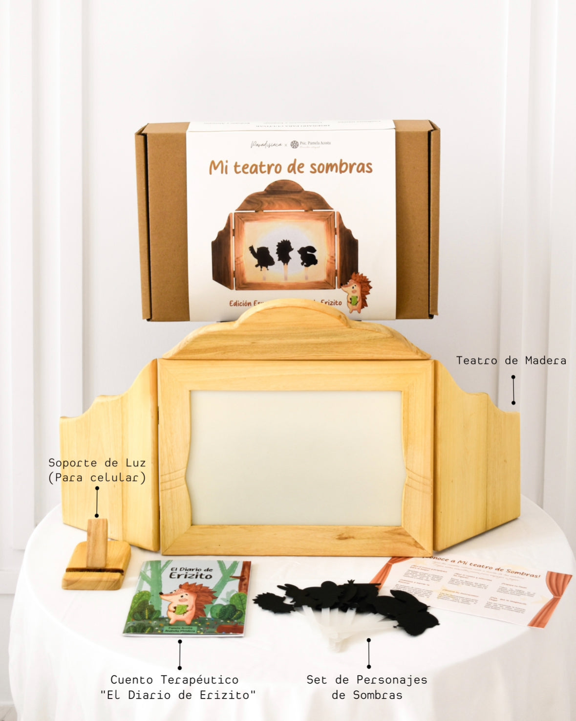 Diseñado en colaboración con la Psic. Pamela Acosta, ” Mi teatro de Sombras” fusiona la artesanía con la psicología infantil. Es un espacio seguro donde, a través de la narrativa terapéutica de "El Diario de Erizito", tu hijo aprenderá a validar sus emociones más complejas como la frustración y el enojo transformándolas en un momento de calma y aprendizaje.